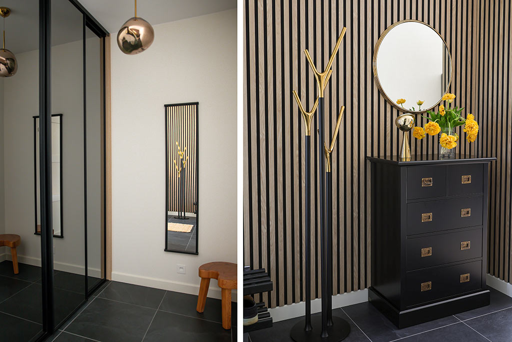 I hallen finns en gästtoalett, förvaring bakom skjutdörrar och en dekorativ ribbvägg.