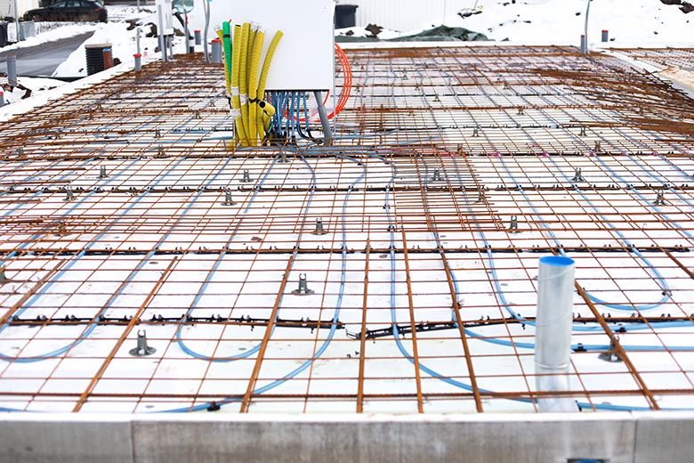 Cellplast, golvvärme, VVS, el och armering är på plats och plattan är redo för gjutning.