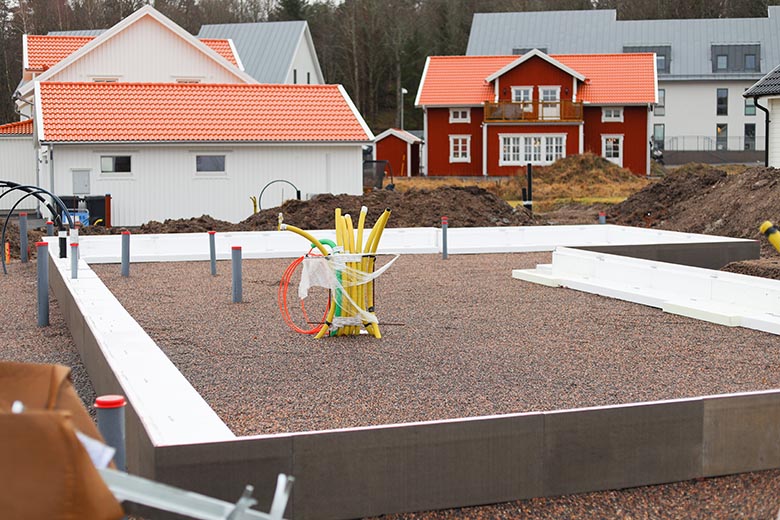 Med grovutsättningen som grund kan markentreprenören i sin tur mäta ut med laser var allt på tomten ska hamna. De gräver ner vatten, avlopp, dränering och slangar för el och fiber på tomten innan de förbereder marken.