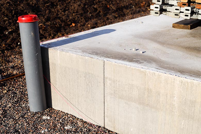 Nu kan man kontrollera att vatten och el kommer upp ur marken på rätt ställe. Markentreprenören har förberett en färdig flisbädd och sett till att tomten är utjämnad och avvägd på rätt höjd.