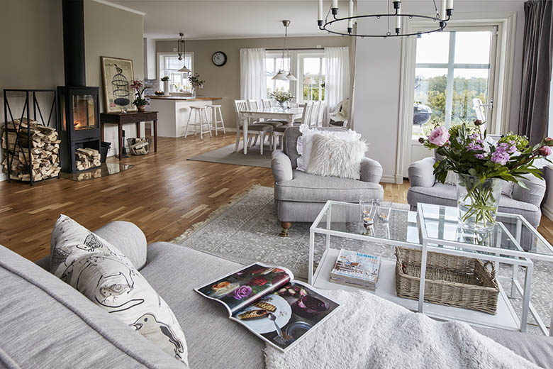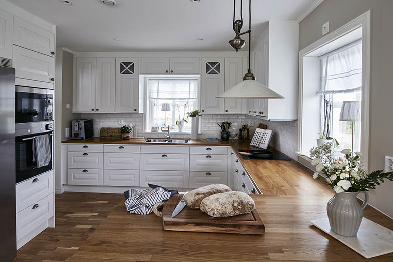 Husets färger går överlag i ljusa toner. Här finns gott om fönster, vilket ger ett fint ljusinsläpp och vacker utsikt mot ekarna och ängarna på baksidan. Fönstren präglar och förhöjer alltid husstilen och Sofia och Fredrik valde korsspröjs till de större fönstren och krysspröjs till de mindre. Även köksinredningen har inslag av krysspröjs.