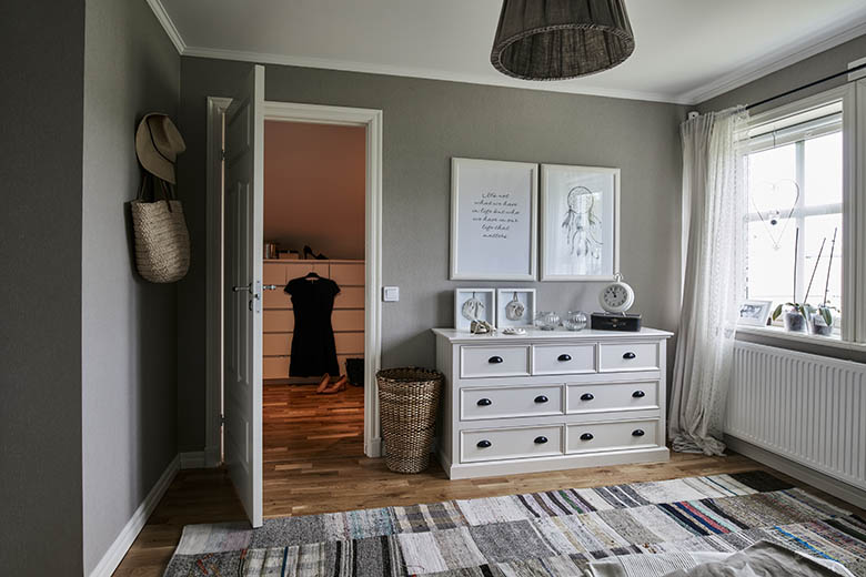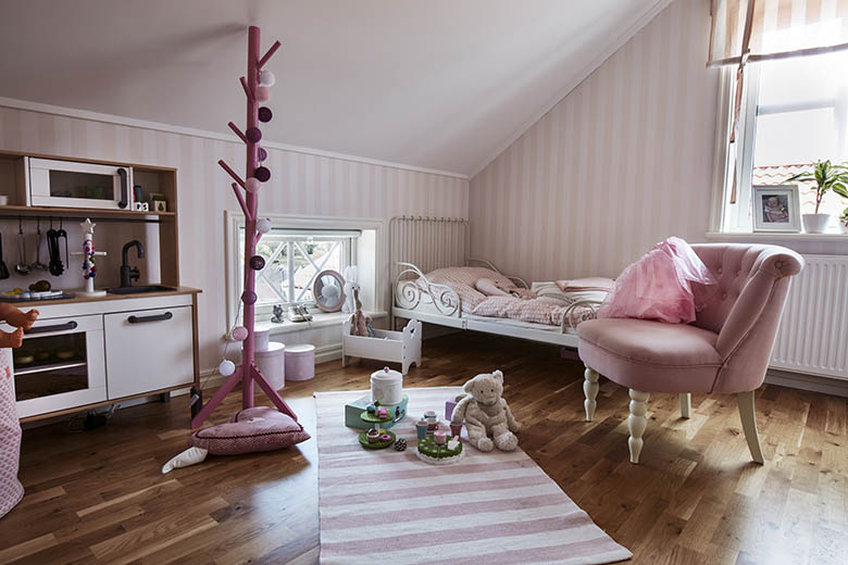 Bottenvåningen domineras av de sociala ytorna, medan ovanvåningen blir mer privat med sina tre sovrum, badrum, allrum och – inte att förglömma – en praktisk walk-in closet.