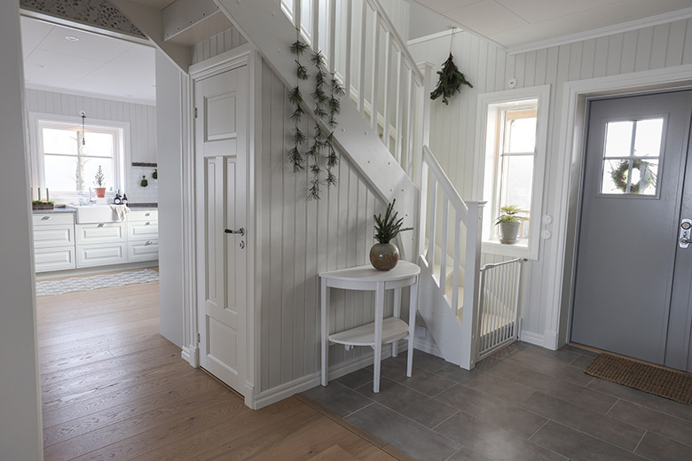 I den rymliga hallen har de valt att placera en liten garderob i utrymmet under trappan.