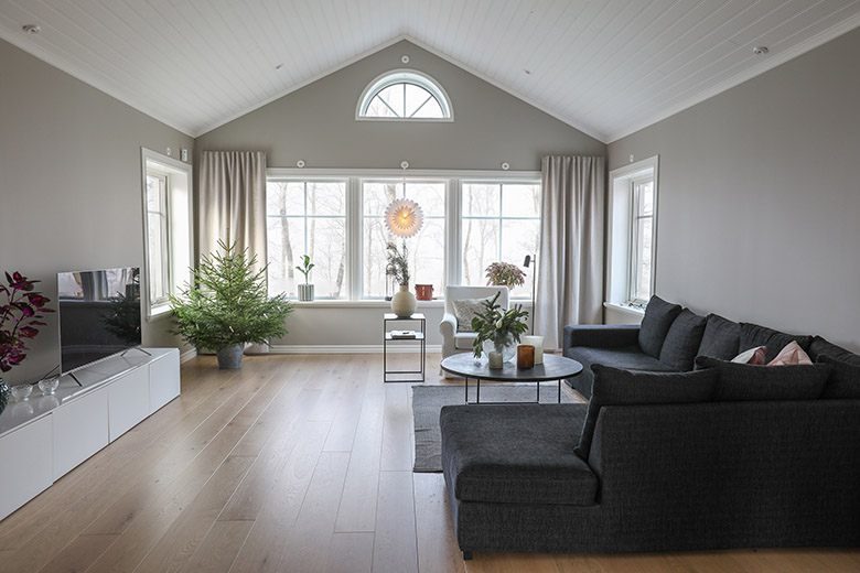 “Det var så smidigt att gå runt i Alingsås Huspakets showroom i Bergstena för att kunna se och känna på olika material och göra våra val. Där fanns det till exempel ett trappräcke som vi fastnade för direkt. Alingsås Huspaket har ett interiörpaket med detaljer i lantlig stil. För det mesta höll vi oss inom det paketet och då blev det enklare att välja.” säger Wictor.