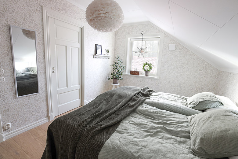 Anna och Wictors sovrum har härligt ljusinsläpp och här inne går inredningen i lugna och sköna toner. De valde även att göra plats för en walk-in-closet som göms bakom en praktisk skjutdörr.