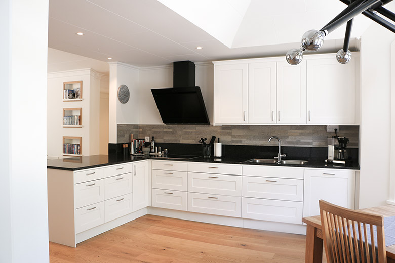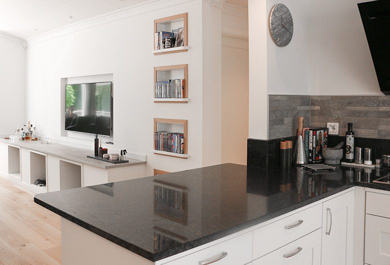 Vitt stilrent kök med bänkskiva i svart kompositsten.