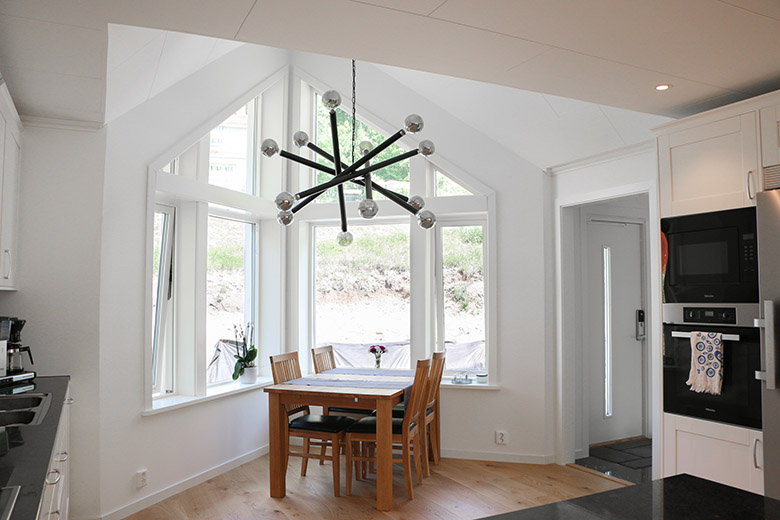 I det unika burspråket på framsidan av huset har Johanna och Henrik placerat sitt köksbord. Där är det öppet till nock vilket ger en rymd i köket och ett härligt ljusinsläpp. Det är en öppen planlösning mot vardagsrummet där både en soffa för stort umgänge och ett långt matbord ryms. Även här är det öppet till nock men eftersom att denna del av huset har en annan riktning skapar takets vinklar en spännande kontrast.