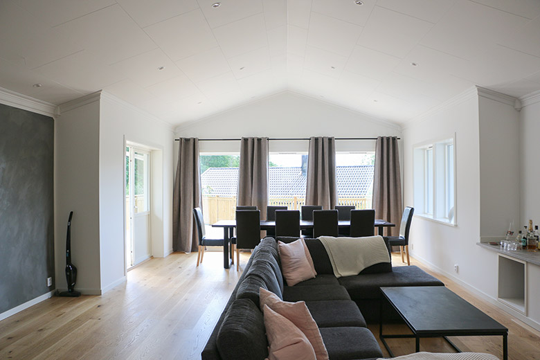 “När vi hade börjat bygga huset tittade vi efter en passande TV-bänk, men vi hittade ingen som vi gillade eller som var tillräckligt stor för att passa den stora väggen. Därför gjorde vi en platsbyggd bänk med bra förvaring längs hela väggen. Det är en bänkskiva från Ikea och den har redan kommit till användning som bland annat buffébord.” berättar Johanna.