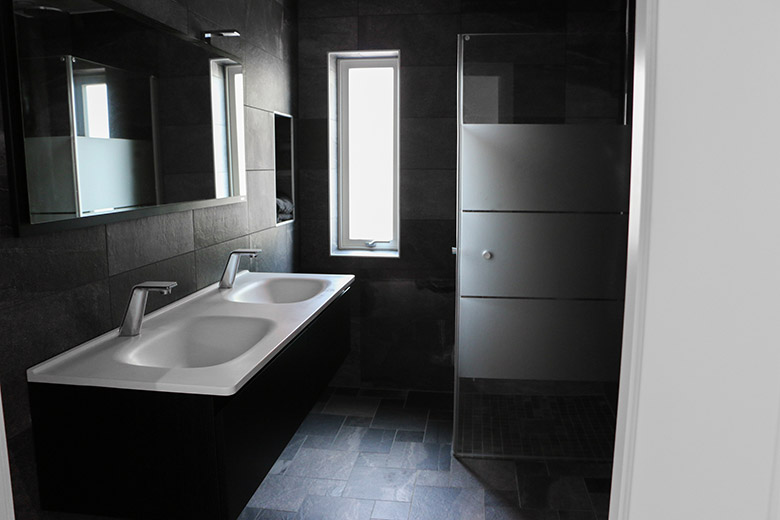 Ett av husets stora badrum med dubbla handfat, toalett och dusch.