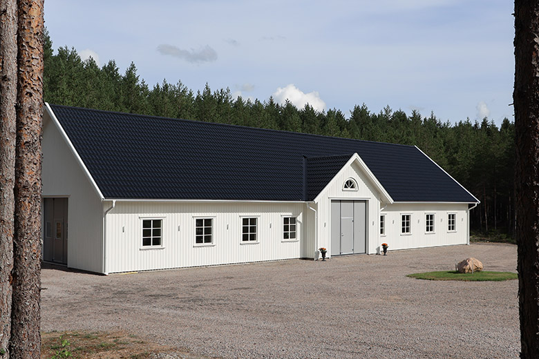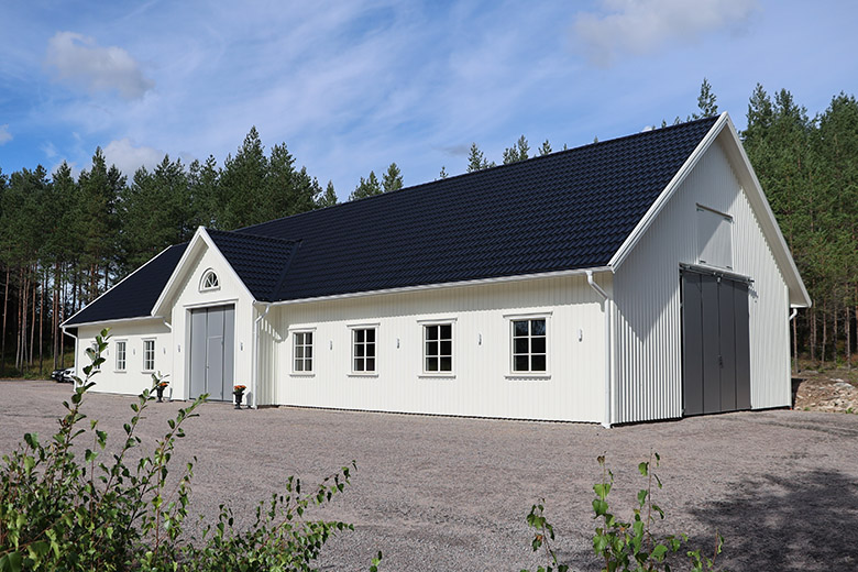 Ett klassiskt och stilrent enplanshus har levererats till familjen Martinsson i Vårgårda, tillsammans med en stor maskinhall i samma stil. I korridorerna hos Alingsås Huspaket har ordet om detta imponerande bygge spridit sig, för visst är det något speciellt med en maskinhall i lösvirke på 300 kvadratmeter, med träpanel och spröjsade fönster? Vi gjorde ett besök för att se hur Roger och Susanne har det på gården.