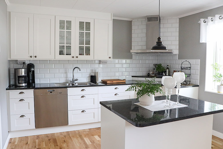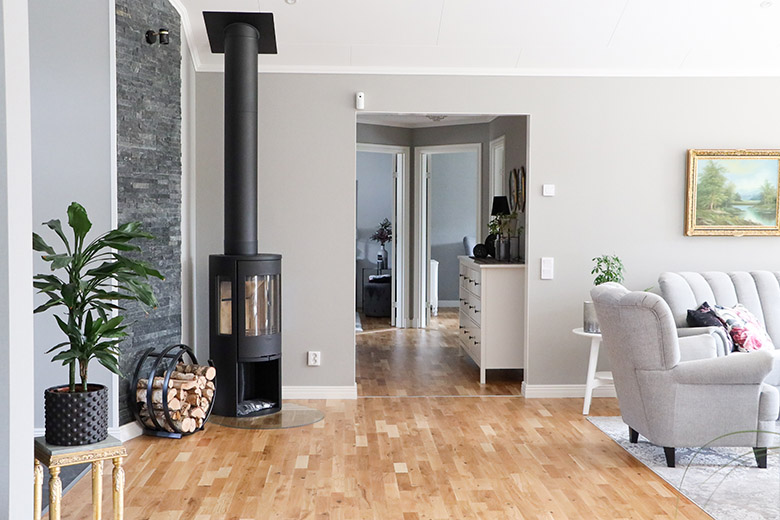 “Vi ville ha en ljus inredning utan att allt skulle bli helt vitt, så vi har genomgående valt gråa nyanser i huset. För det mesta har vi hållit oss inom vår budget, men vi gjorde några val där vi medvetet gick över budgeten. Det var stenbänkskivan i köket och marmorgolvet i hallen och badrummet som vi bestämde oss för att lägga lite extra på, och även all belysning.” berättar Susanne.