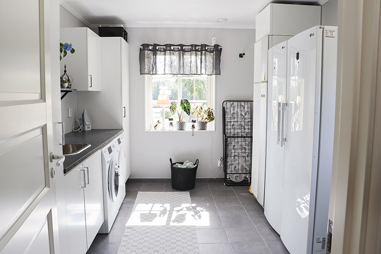 En stor och öppen tvättstuga med plats för en extra kyl och frys.