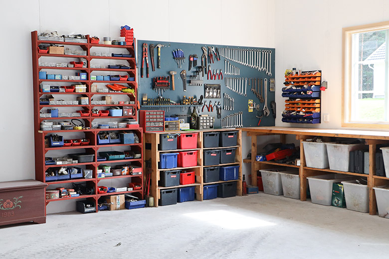 Maskinhallen är på 300 kvm. 100 kvm är isolerat och där ligger verkstaden med gott om plats att köra in fordon och alla verktyg ordnade i fina rader. I den oisolerade delen om 200 kvm finns plats för allt från husvagn till jordbruksmaskiner. Det är förberett med en lucka på gaveln och en viss typ av takstol som gör att man i framtiden kan göra ett loft i maskinhallen. På frågan vad de är mest nöjda med kring bygget och huset kan Roger inte välja en sak.