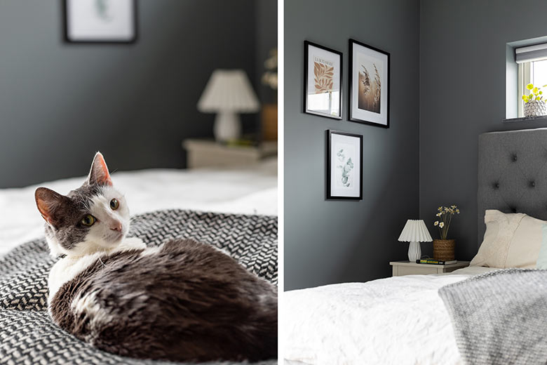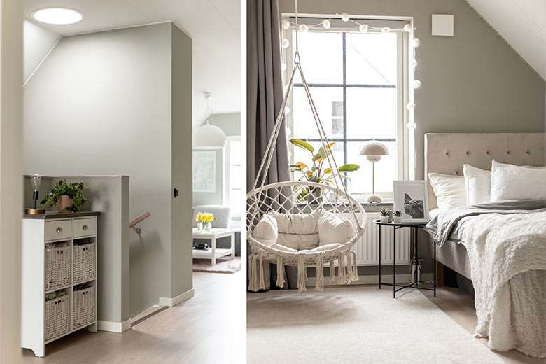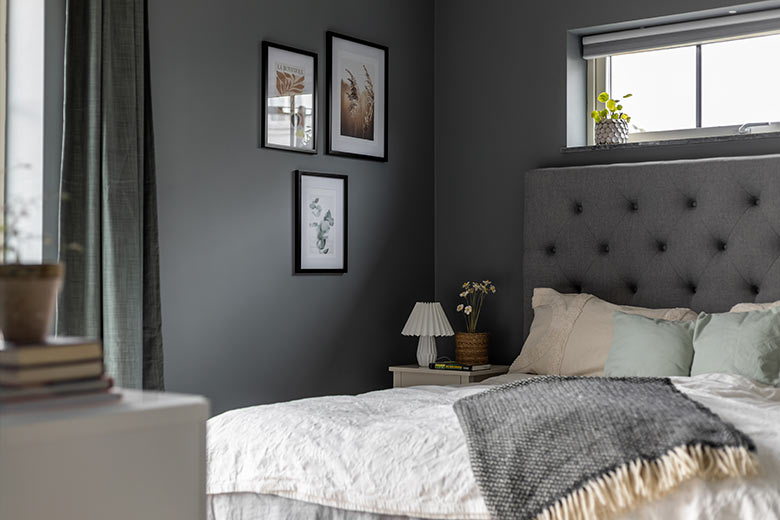 På nedervåningen ligger Daniel och Carinas sovrum. De mörka väggarna skapar ett behagligt lugn.