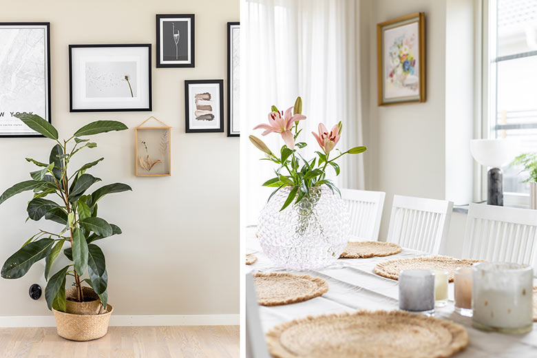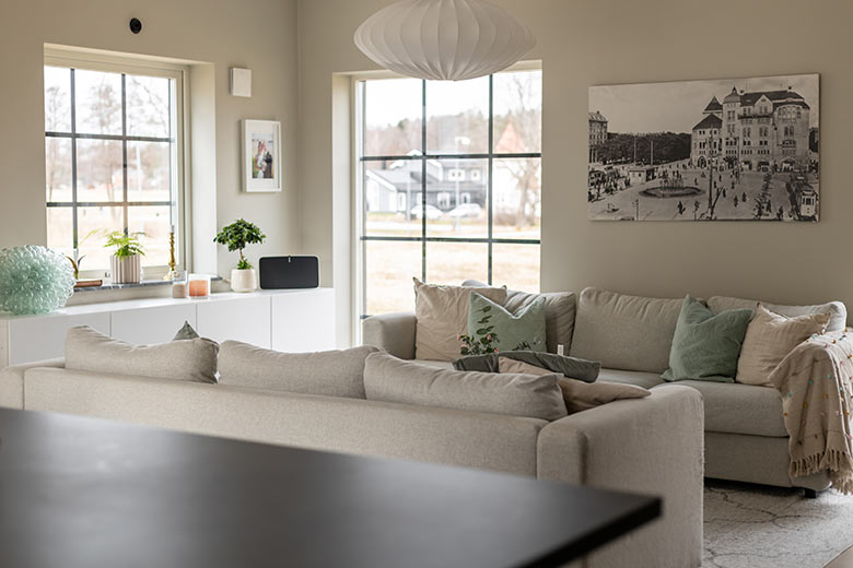 “Jag måste nog hålla med och säga samma sak, det som jag är allra mest nöjd med i huset är badrummet på nedervåningen, även tvättstugan är jag väldigt nöjd med. Den är både praktisk, snygg och rymlig. Jag är också glad att vi tog lite större fönster i vardagsrummet och matplatsen än vad vi tänkt från början. Såhär i efterhand skulle vi vilja ha ytterligare ett fönster i vardagsrummet. De stora fönstren är härliga och släpper in ett skönt ljus.” säger Carina.