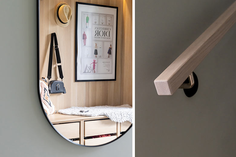 Något som Carina och Daniel tyckte var utmanande att få till var husets trappa. De ville inte ha den klassiska placeringen där trappan börjar i hallen, och man drar med sig grus från dörrmattan när man går mellan entréplan och övervåningen. Trappan placerades istället centralt i huset och byggdes in så att utrymmet under trappan kan nyttjas till förråd.