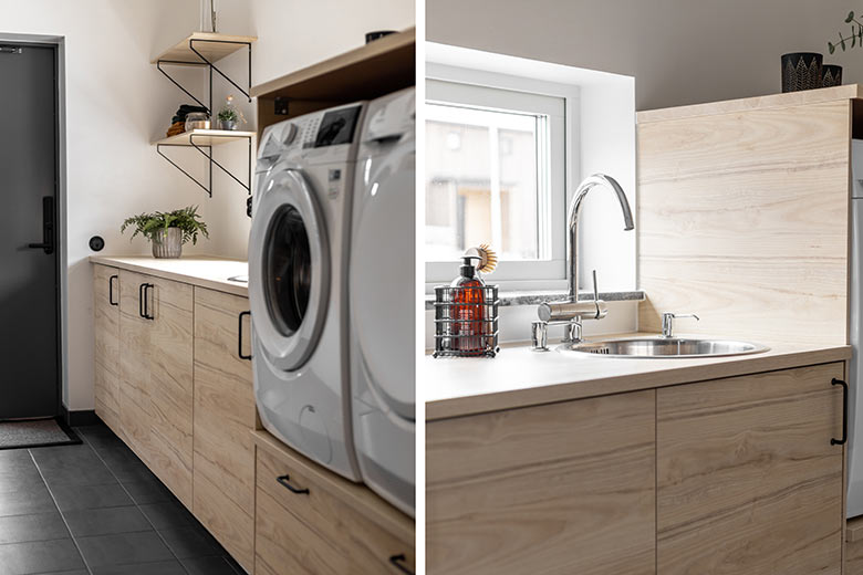 Den rymliga tvättstugan har egen ingång och är både stilren och praktiskt genomtänkt.