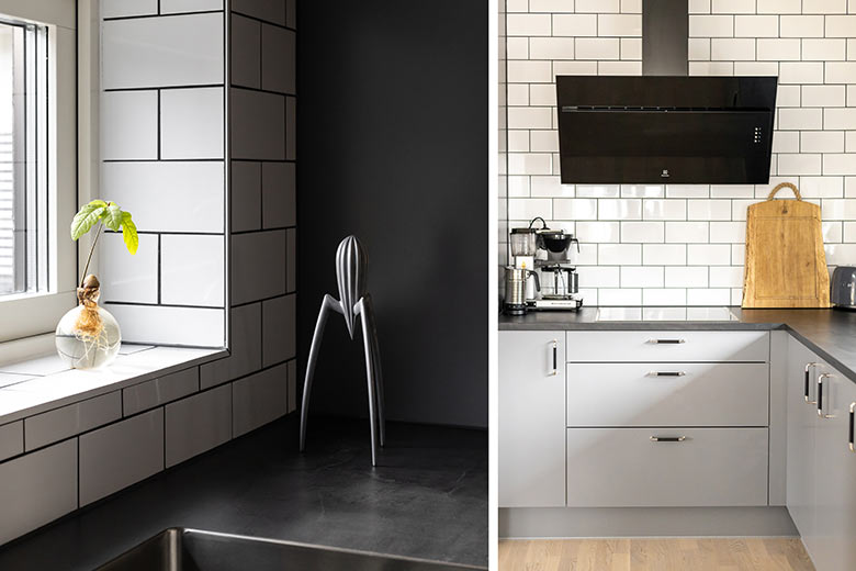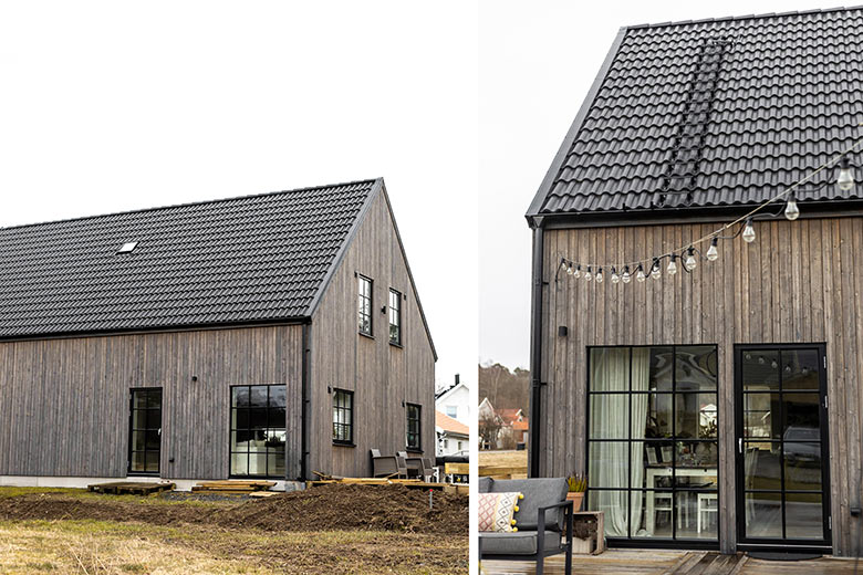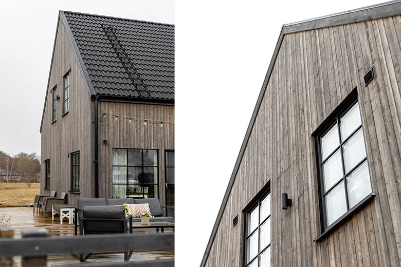 Den vackra fasaden är målad med tjärvitriol och svarta detaljer går igen både exteriört och interiört i huset.
