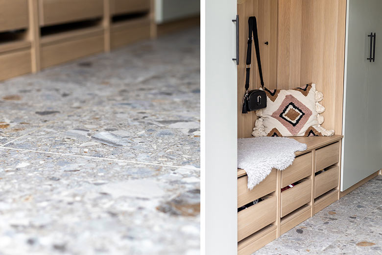 Den snygga platsbyggda garderoben i hallen byggde Daniel själv av stommar från IKEA. Det vackra golvet kommer från italienska Mirage.