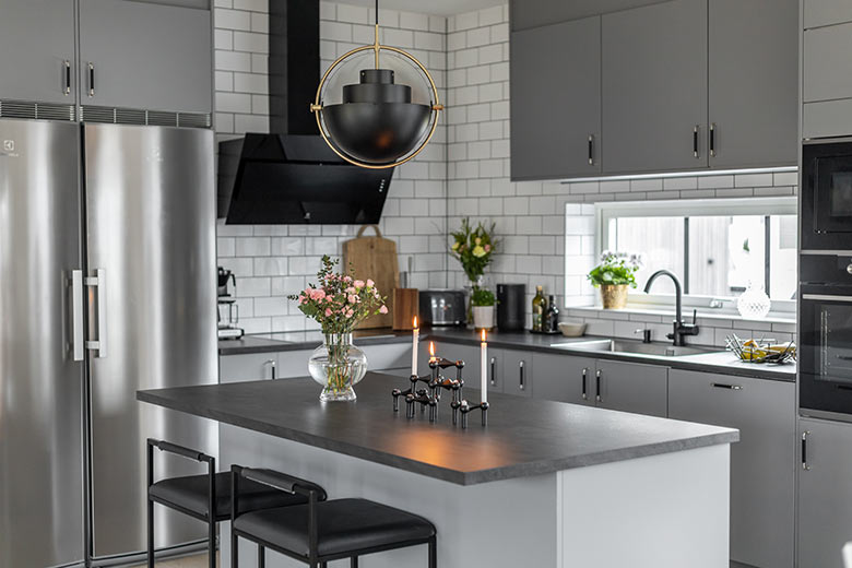Köket går i en behaglig grå färgskala och färgen skiftar beroende på hur ljuset rör sig under dagen.