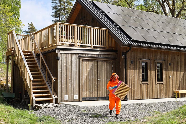 När vi ska göra reportage hos människor som har byggt hus med oss på Alingsås Huspaket hör det inte till vanligheterna att vi får besöka dem på jobbet. Men idag tar Ingrid och hennes man Joachim emot oss på Ingrids jobb. Denna gången är det inget bostadshus vi fått vara med och bygga, utan ett otroligt fint hus för Ingrids verksamhet där hon arbetar på heltid som yrkesbiodlare. Ett honungshus!