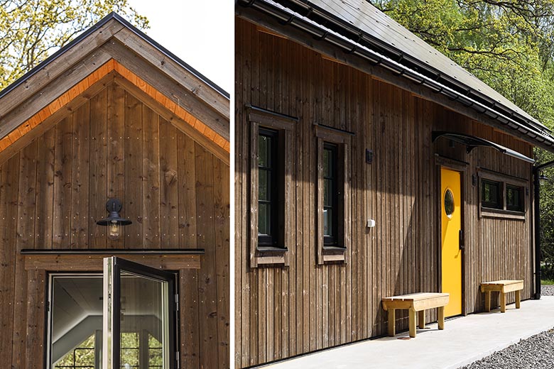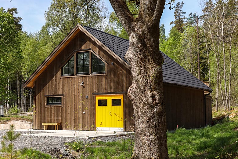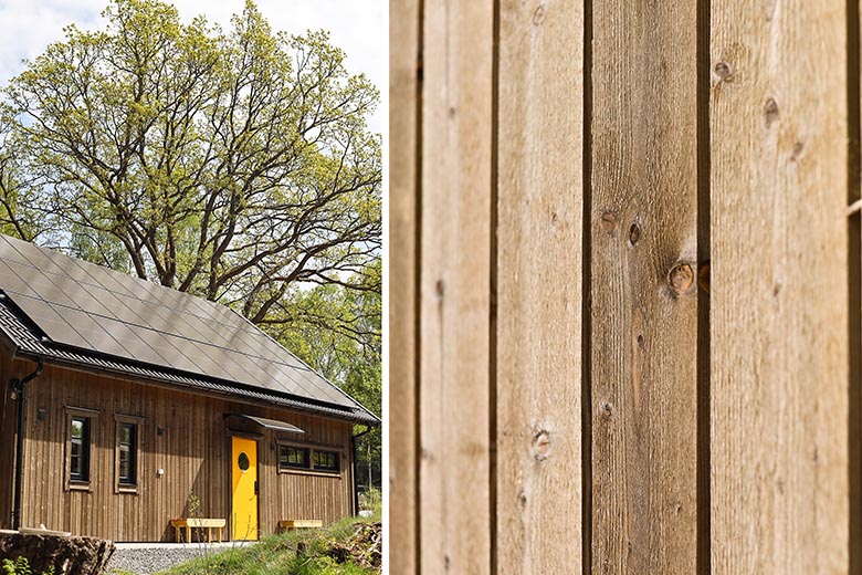 “När vi tog kontakt med Alingsås Huspaket hade vi en skiss över hur planlösningen skulle se ut. Vissa detaljer var väldigt noga för oss, medan vi knappt hade tänkt på utsidan av huset. Vi visste bara att vi ville ha järnvitriol och att ytterdörrarna skulle vara gula, jag lade mycket tid på att hitta den rätta gula färgen för att specialbeställa dörrarna. Vi hade ett möte på Alingsås Huspaket där vi gjorde alla exteriöra val, Svante blev nog lite nervös eftersom att vi inte hade tänkt så mycket på utsidan. Nu efteråt undrar vi hur huset kunde bli så här snyggt med tanke på det röriga mötet”, säger Ingrid och skrattar.