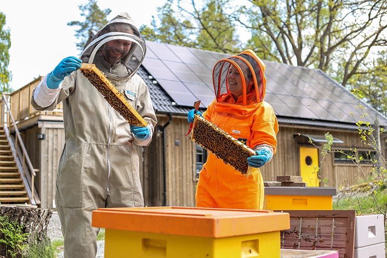 Innan Ingrid skolade om sig och startade sitt företag Gyllene Biet arbetade hon som lärare i ämnena musik och spanska. Joachim arbetar som områdespolis och har lärt sig mycket om biodling tack vare Ingrid. Paret kollar till bikuporna som står på hemmaplan, några meter från Honungshuset. “Här på denna ramen som jag håller i är det bara honor nu”, säger Joachim. Ingrid kollar till ramen och utbrister: “Ja det stämmer, vad duktigt du är!”