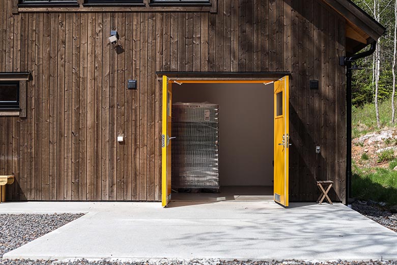 “Kom så går vi in i huset via den här porten, så tar vi honungens väg”, säger Ingrid. På 16 olika platser runt om Alingsås, Lerum och Sävedalen har Ingrid ställt ut sina bikupor, och när det är dags för skörd hämtar hon hem honungen i sin bil och backar upp mot porten. Joachim kom med idén att gjuta en separat platta runt huset för att underlätta av- och pålastning av både honung och annat material som behövs för produktionen. En detalj som underlättar det tunga arbetet som honungsproducent. Ungefär 3 ton honung rullar ut från honungshuset varje år.