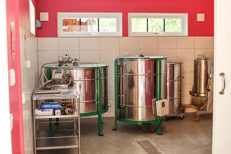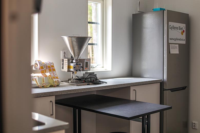 Den gula porten på husets gavel öppnas upp, och innanför finns plats att förvara de 9000 glasburkar som ska fyllas med färdig honung denna säsongen. Till vänster ligger slungrummet där ramarna från bikuporna placeras och honungen slungas. Efter slungrummet kommer diskrummet, men också en entré där man kommer in om man inte gör som vi och tar honungens väg in i huset. Innerdörrarna som leder oss mellan rummen är extra breda och har karmar i aluminium för att klara kraven för livsmedelshantering.