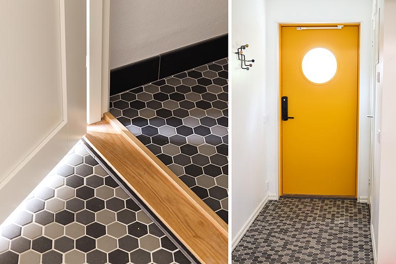 På golvet i hallen och i badrummet ligger en mosaik med samma form som honungsceller.