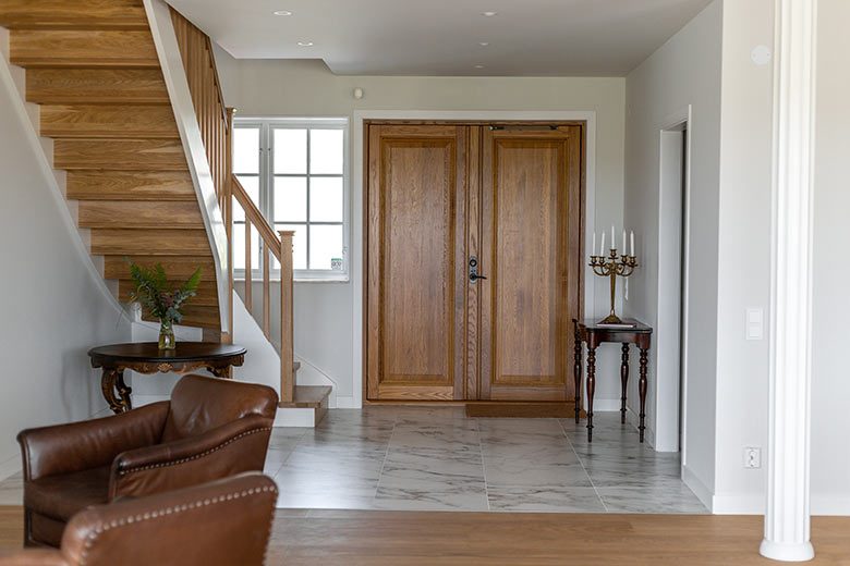 Den rymliga hallen hemma hos familjen Stenseke har ljusinsläpp både från fönster i dörrarna och fasta fönster vid sidan om. De har förvaring under trappan och väggytor som går att möblera. Hallen kompletteras med en groventré.