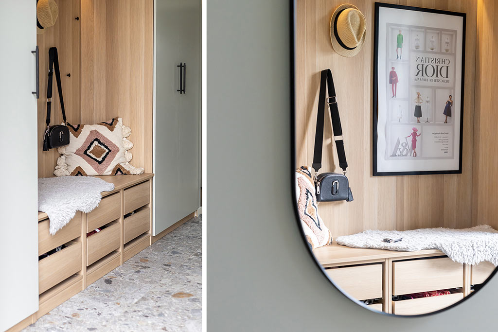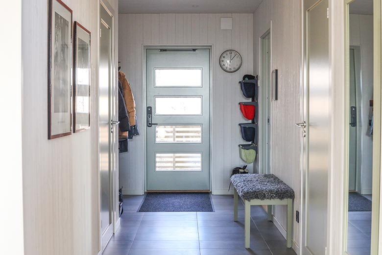 Familjen Blomster har byggt en praktisk groventré med en passage till huvudingången. Passagen har fått praktisk inbyggd förvaring för alla familjemedlemmar.