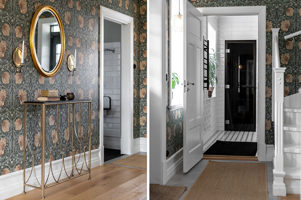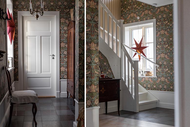 Hallen hemma hos Ellen och Robin känns ombonad och varm med mönstrade tapeter. Till vänster om ytterdörren finns en inre hall med en dörr som leder till grovingång och tvättstuga.