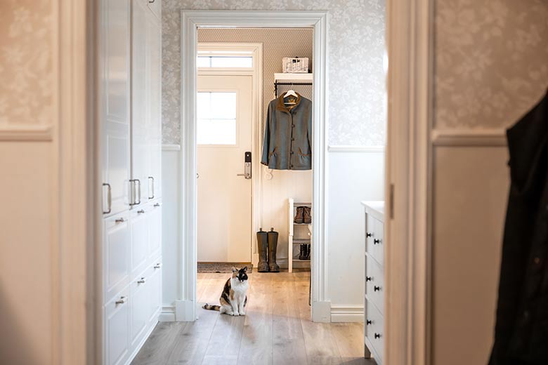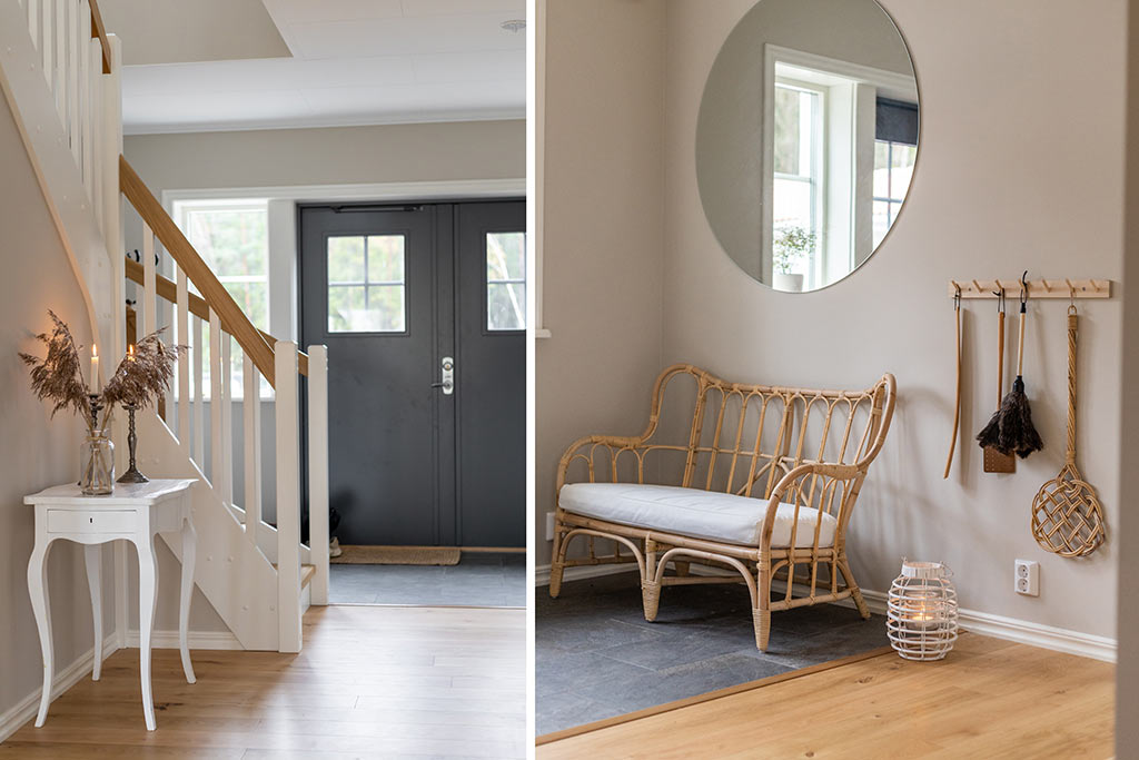 Familjen Kalm har en klassisk entré med bra förvaringsmöjligheter. Sittplatsen blir en inbjudande detalj till inredningen. Fyra fönsterrutor i ytterdörren släpper in dagsljuset i hallen. Dörrmattan som är aningen nedsänkt i klinkergolvet blir en fin detalj.