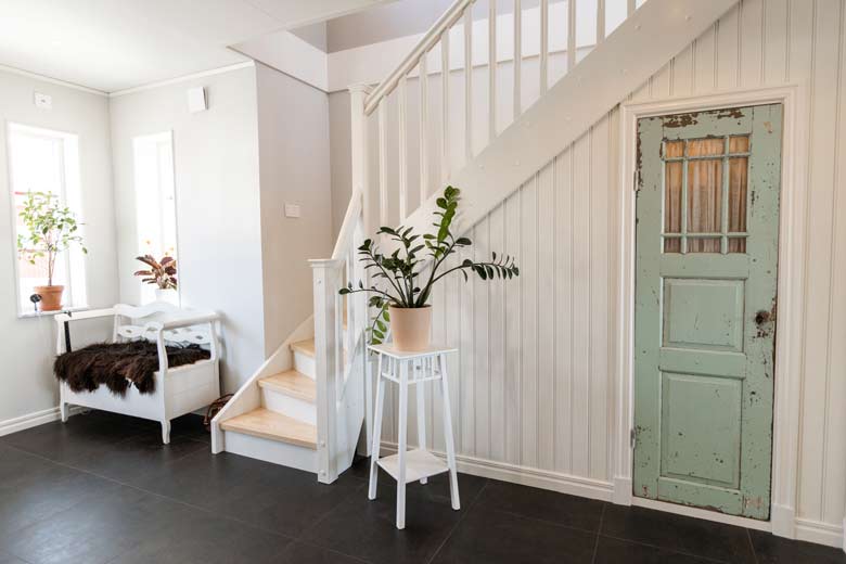 På landet hos familjen Lorentzon har man skapat en personlig känsla genom att använda en gammal dörr som leder till förvaringsutrymmet under trappan. Här får man även ljusinsläpp från fönster i två väderstreck.