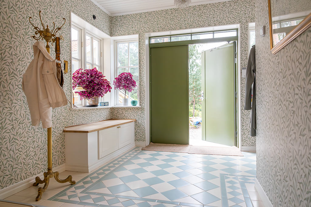 I hallen i familjen Larssons sommarhus möts man av en vacker blå tapet som blir ett blickfång när man kommer innanför dörrarna. Här har de även planerat in en väggyta mellan dörrarna som blir perfekt förvaring av nycklar mm.