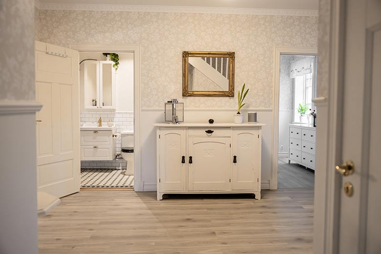 Hallen är ett rum som slits snabbare än andra rum i huset på grund av blöta ytterkläder och smuts som dras med in. Se till att tänka igenom materialvalen i hallen extra noga. Är golvet tillräckligt tåligt? Syns smuts direkt så du kommer behöva städa ofta? Vilken färg och vilket material väljer du till väggarna?