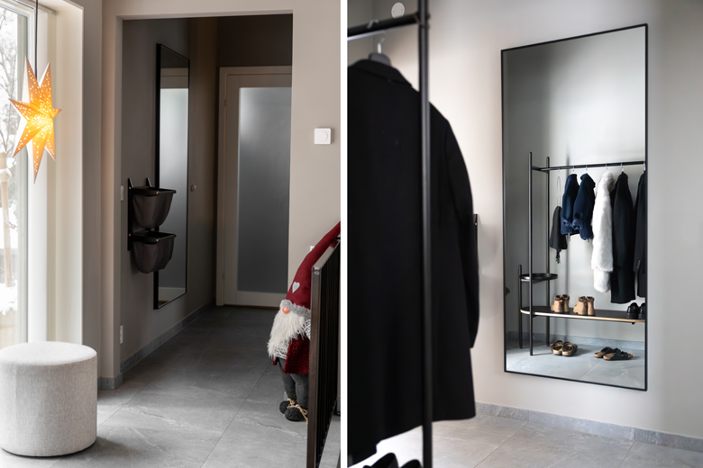 Familjen Jokela har en stilren entré och har byggt ett utrymme med klädförvaring till vänster när man kommer in genom ytterdörren. De har också ett stående fönster (sidoljus) bredvid ytterdörren som skapar ett fint ljusinsläpp i hallen.