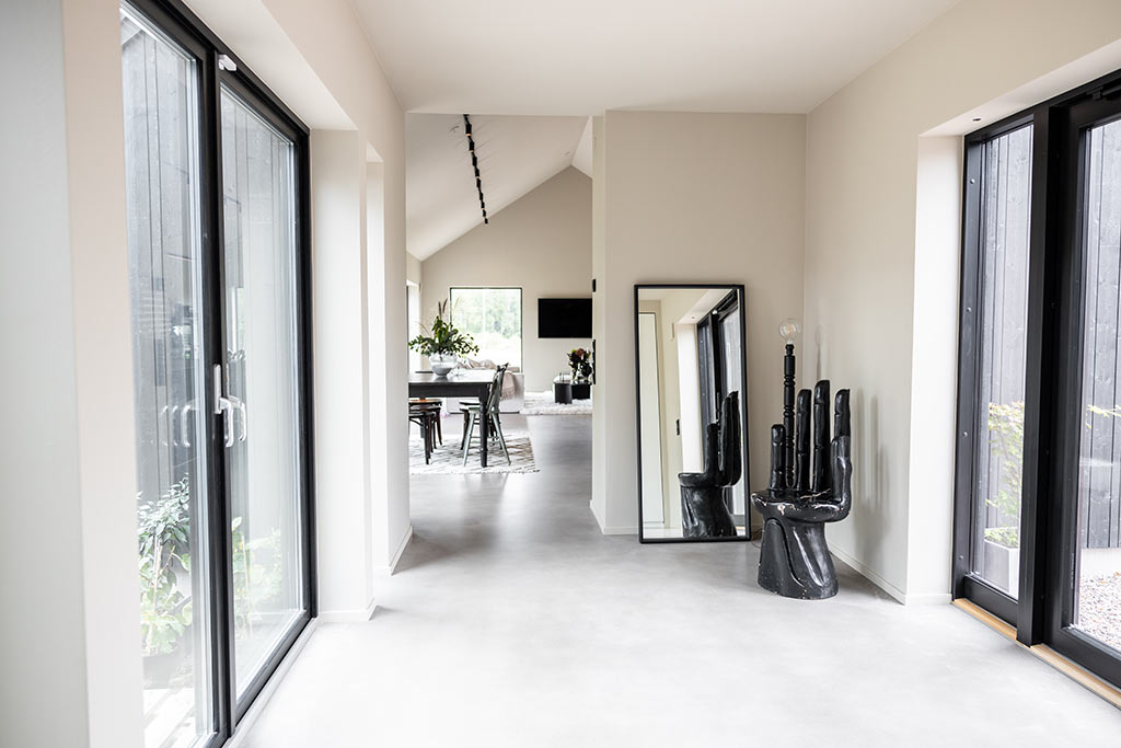Familjen Ericsson har byggt en modern och minimalistisk hall med glasdörrar i fil. En så kallad “Breezeway”. Från husets huvudentré kan man se rakt igenom hallen till den vackra trädgården. Hallen kompletteras av en välplanerad groventré.