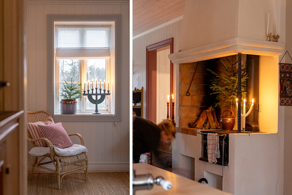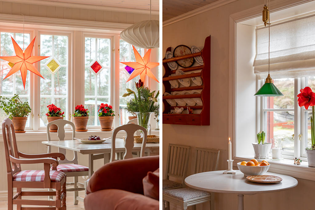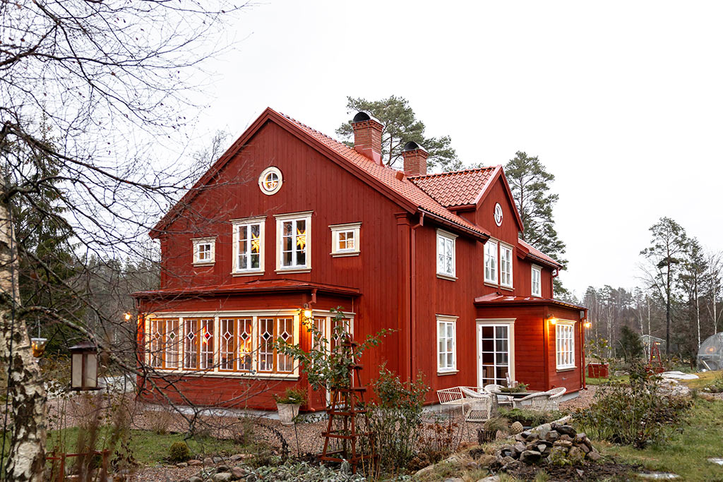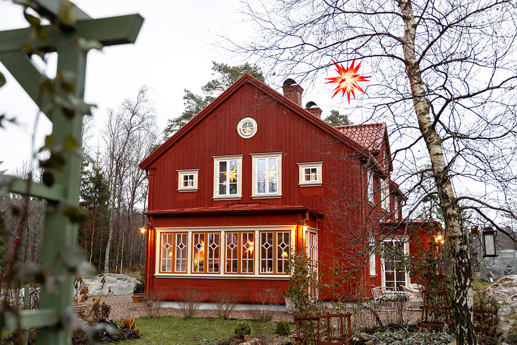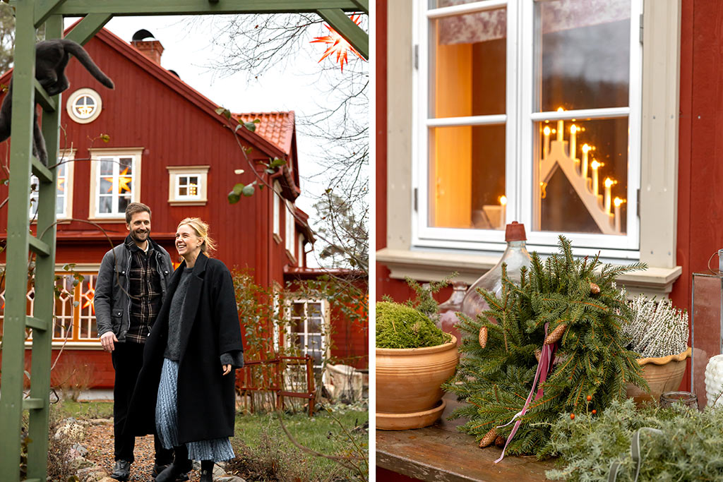 För 2,5 år sedan flyttade Beata och Johan in i sin nybyggda husdröm med sina tre barn; Jens, 7 år och tvillingarna Måns och Truls, 6 år. Beata som är uppvuxen här på Orust hade övertalningsförmågan som krävdes för att få med sig Johan från centrala Göteborg ut till kusten. Familjen har byggt sig en riktigt idyll som så här i jultider strålar ikapp med adventsstjärnorna. Den faluröda villan i gammaldags stil är den perfekta platsen för julstök och adventsmys.