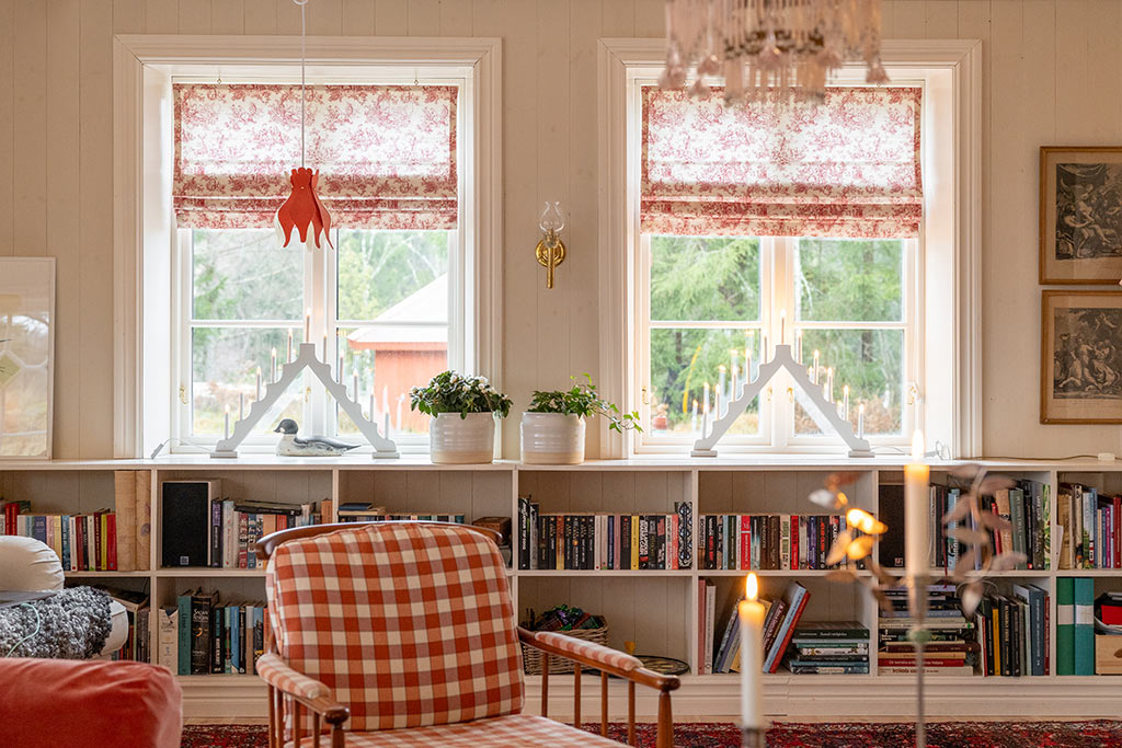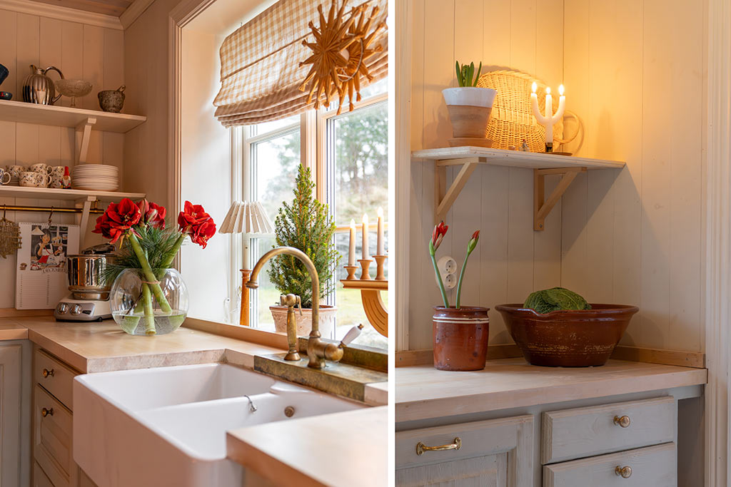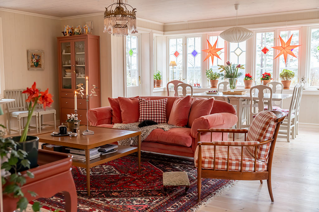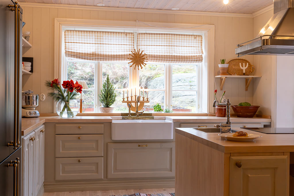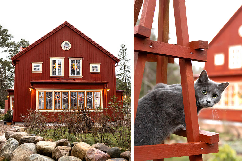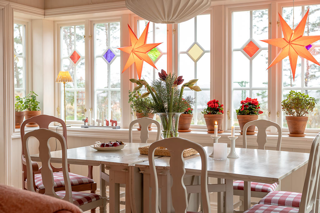 För 2,5 år sedan flyttade Beata och Johan in i sin nybyggda husdröm med sina tre barn; Jens, 7 år och tvillingarna Måns och Truls, 6 år. Beata som är uppvuxen här på Orust hade övertalningsförmågan som krävdes för att få med sig Johan från centrala Göteborg ut till kusten. Familjen har byggt sig en riktigt idyll som så här i jultider strålar ikapp med adventsstjärnorna. Den faluröda villan i gammaldags stil är den perfekta platsen för julstök och adventsmys.