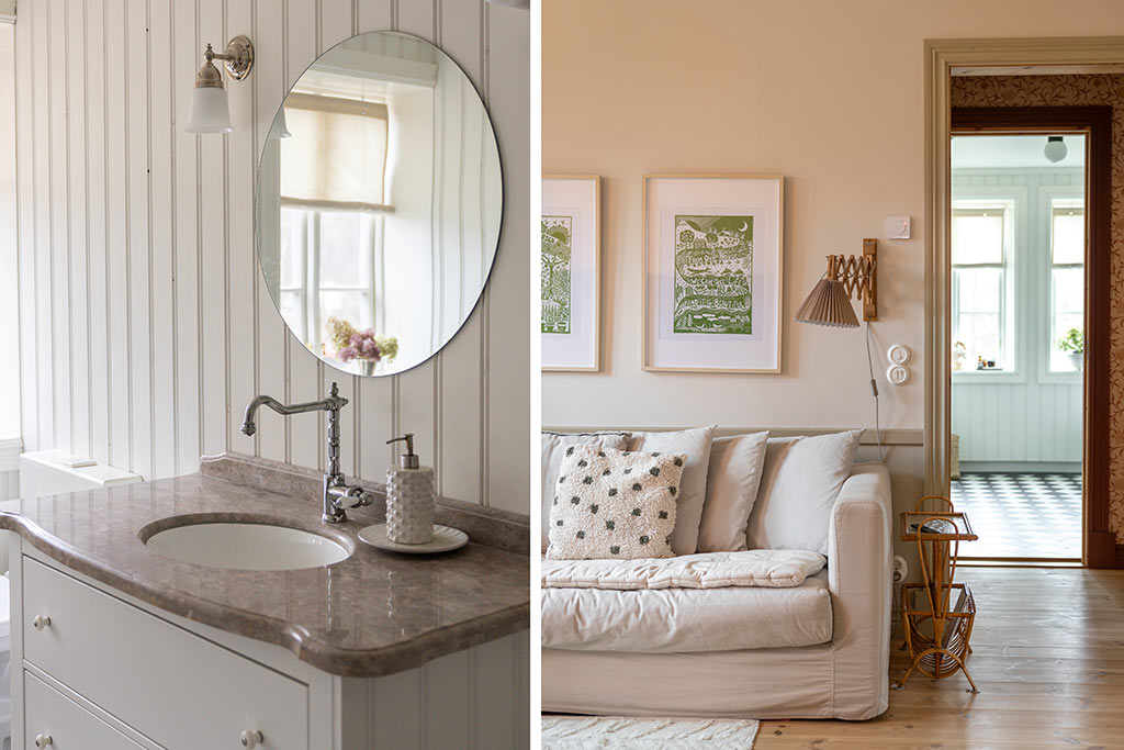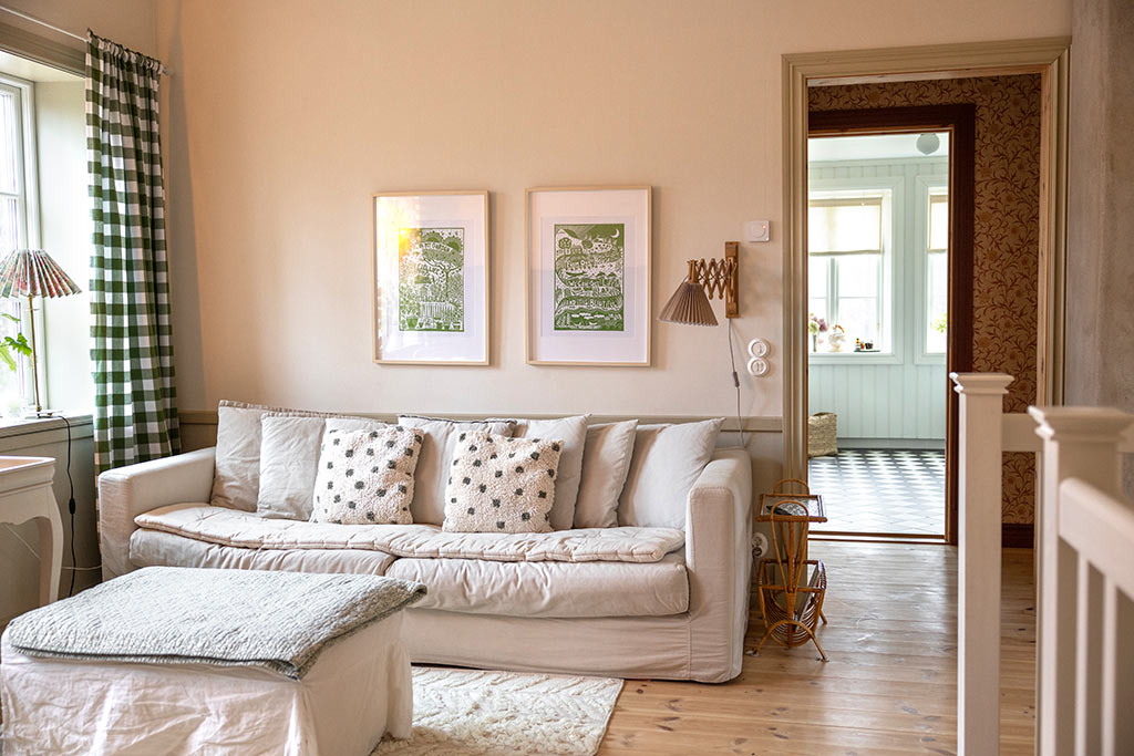 “Jag är lite bättre på att visualisera än vad Johan är, och det har varit skönt att få fria händer. Intresset för inredning är något som kommit med åren. Jag tror att jag fått mycket inspiration från mamma som alltid har handlat mycket fint på loppis och second hand. Innan vi flyttade hit bodde Johan och jag i en lägenhet i ett landshövdingehus i Göteborg. Där gick inredningen helt i vitt och beige. Det var något helt annat än den stil vi har idag. Jag skulle kunna tänka mig att bo i flera hus i olika stilar samtidigt, så att man kan få utlopp för många olika inredningsstilar som är fina”, skojar Beata.