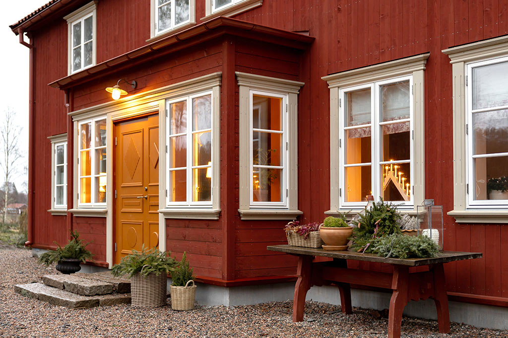 “Det är viktigt att tänka på husets utsida om man vill bygga i gammal stil. Fönstersättningen måste kännas autentisk. Något som vi visste från början var att vi ville sätta fönstren i liv med ytterpanelen, så att fönstren alltså sitter längre ut än vad de vanligtvis gör. När man bygger denna typen av hus hade det sett konstigt ut att flytta in fönstren tycker jag. Här höll arkitekten med oss, även om detta inte är den konstruktionsmässigt bästa lösningen”, säger Beata.