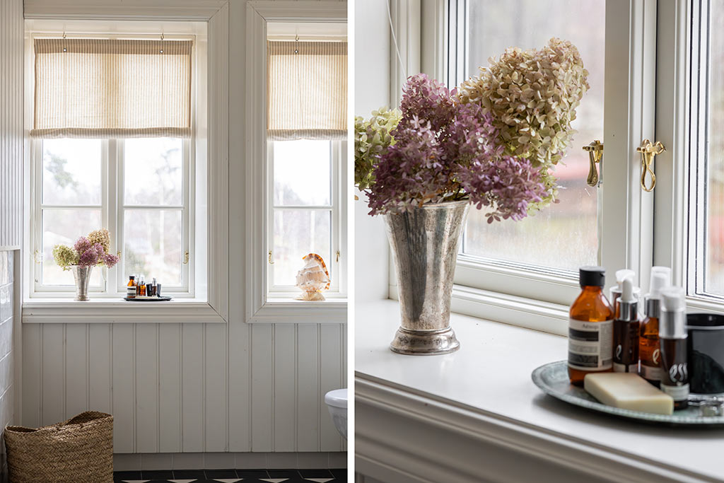 Marmorskivan i det stora badrummet har Beata fyndat på Blocket medan kommoden är från IKEA.