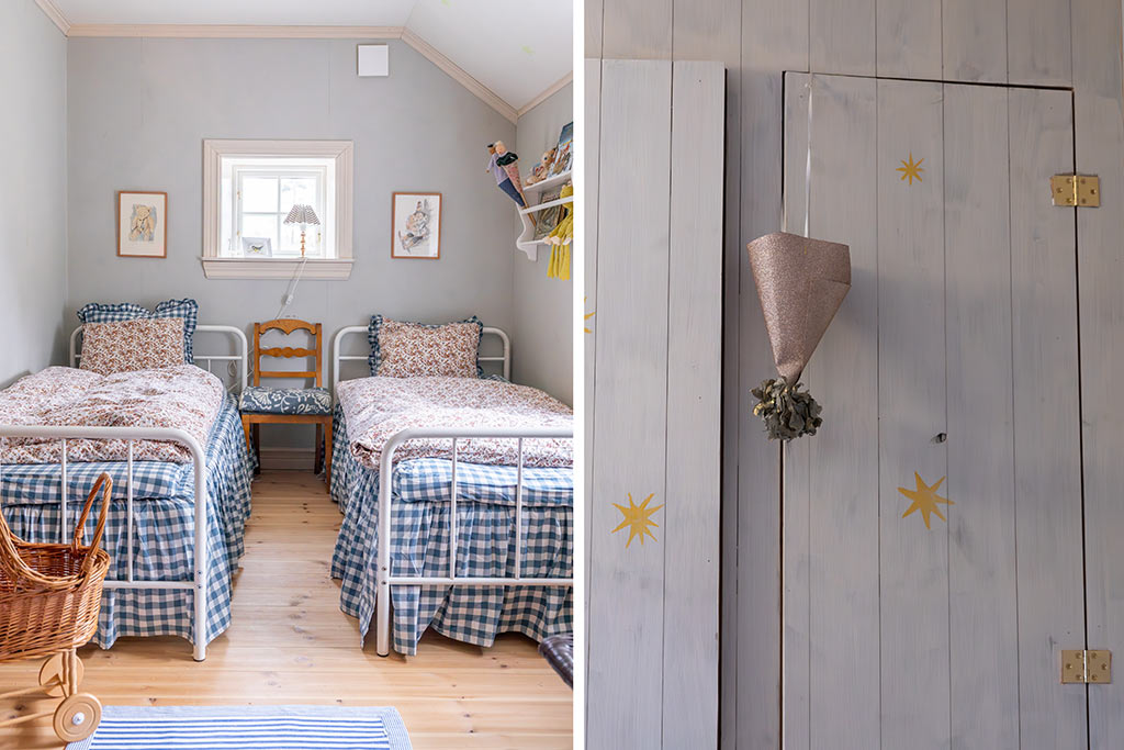 Idag delar tvillingarna rum och färgskalan går i dova blå toner. De platsbyggda garderoberna har Beata dekormålat med stjärnor.