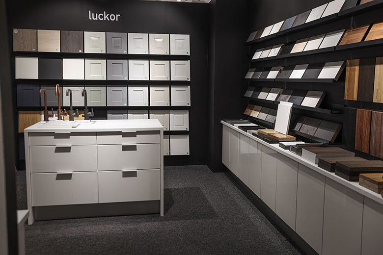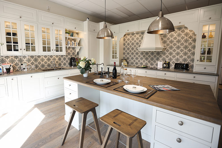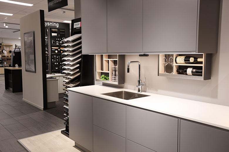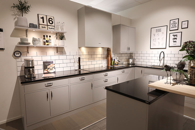 I butiken finns många vackra kök att inspireras av! “För några år sedan sålde vi nästan bara vita kök. Nu ser vi en trend i att många är sugna på mer färg och att de också vågar välja luckor som inte bara är släta och vita. De mest populära färgerna går dock i en dov färgskala med mycket svärta i. Grått, grönt, beige och gråblå toner är mest populärt just nu”. berättar Erik.