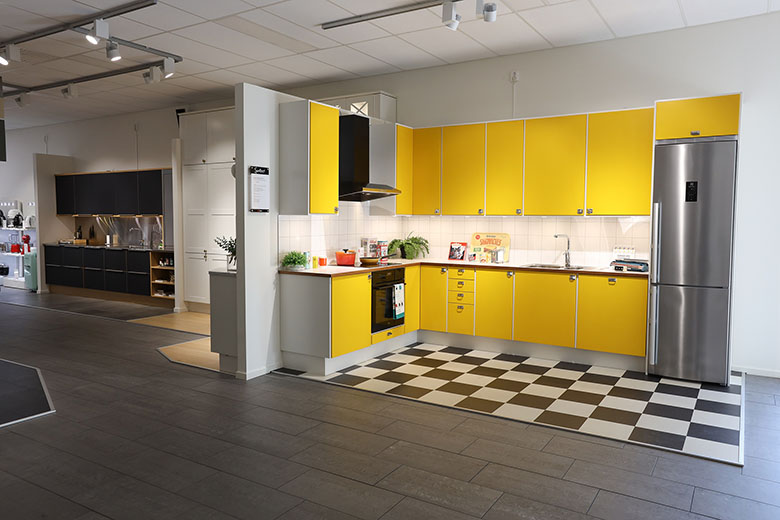 Köket “Retro” fångar mångas blickar i butiken. “Det är inte så vanligt att kunderna väljer just ett så här knallgult kök men vi säljer många grå och gröna varianter av det. Det är kul att det är många som gillar denna retrostilen.” tycker Erik.