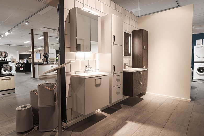 Förutom alla olika stilar som finns att välja mellan på Sentens kök så har de även olika lösningar för ditt nya badrum i sortimentet. Här syns två varianter i ljusgrått och Mörkt trä.