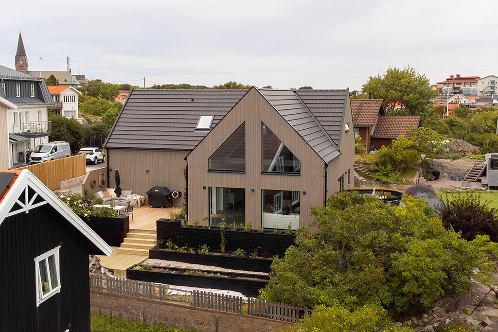 Eftersom huset ligger på en ö i Göteborgs skärgård var det viktigt för familjen att fasaden fick ett bra skydd för att stå emot väder och vind. “Vi kollade på många olika alternativ men det slutade med att vi valde en lasyr efter dialog med vår lokala färgbutik. Panelen levererades sedan mellanstruken från Alingsås Huspaket med den lasyr vi önskade”, berättar Sandra.