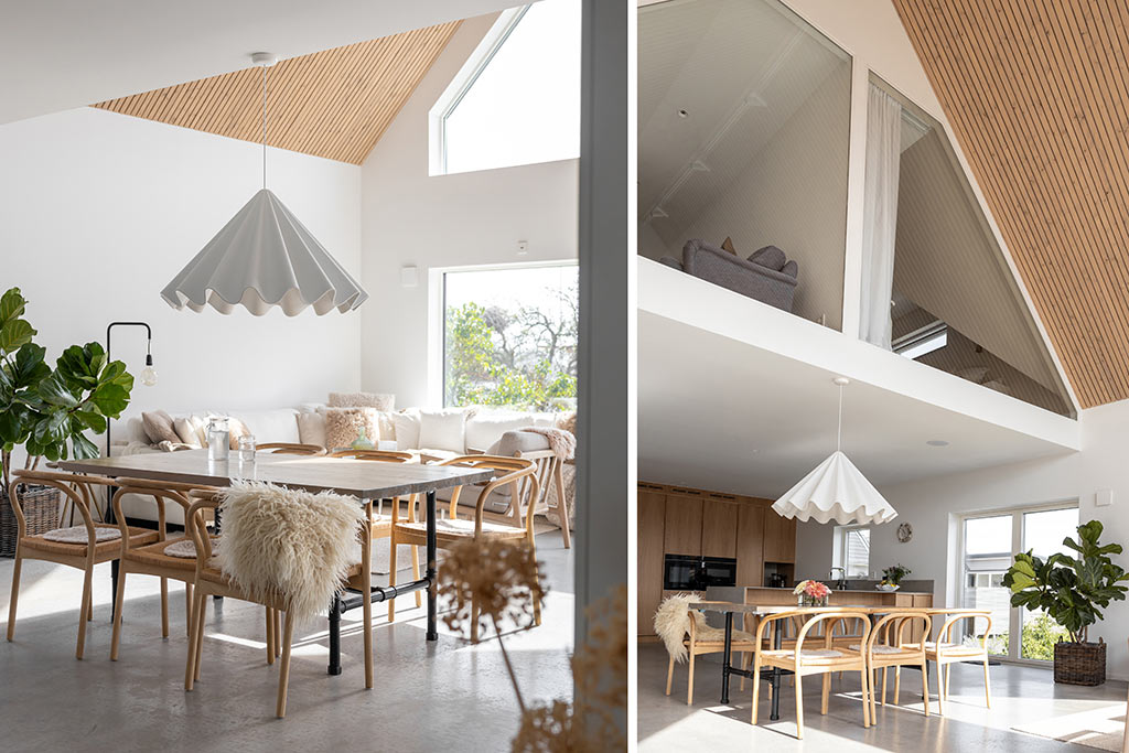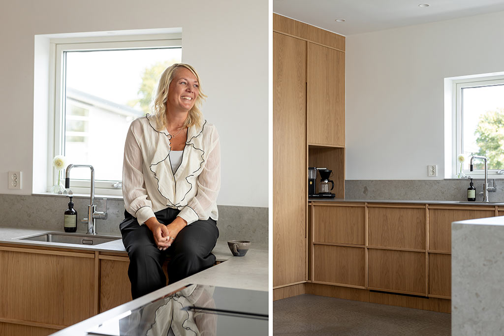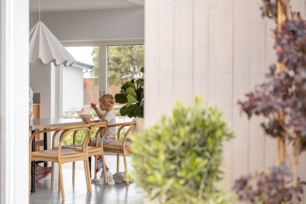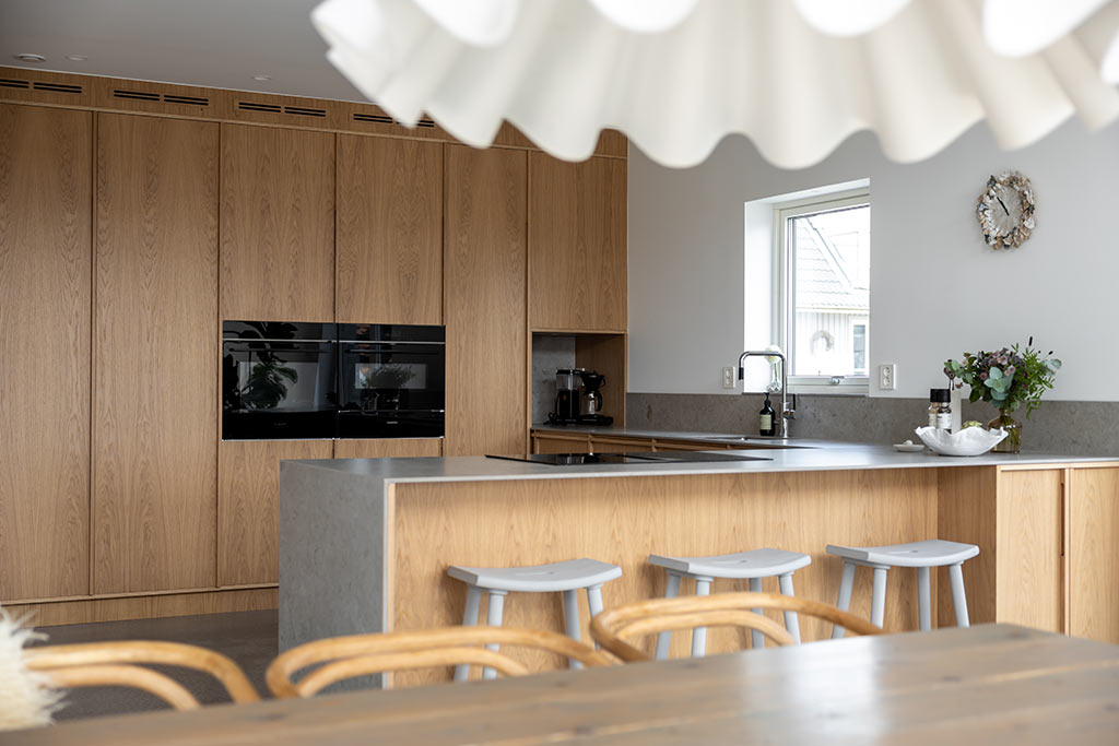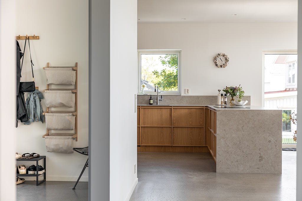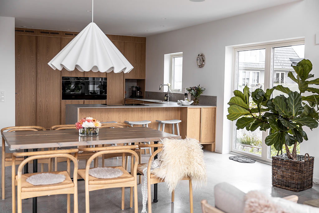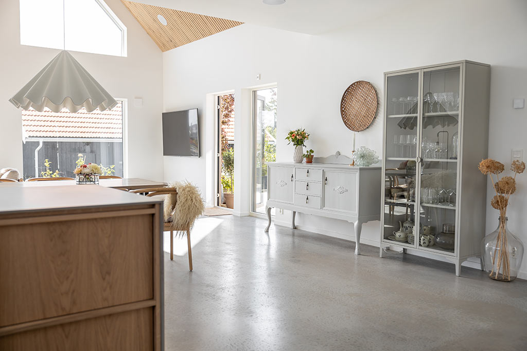 Den öppna planlösningen mellan kök, matplats och vardagsrum är något som Sandra och Fredrik tog med sig från sitt tidigare hus. Dock hade ytan där snabbt känts för liten, och istället för ett 4 meter brett rum ritade Sandra rummet 6 meter brett. Denna välkomnande miljö är husets hjärta. Här släpper de stora fönstren in ljus som faller på det moderna betonggolvet, och det gedigna träköket skapar en fin harmoni tillsammans med familjens möbler.